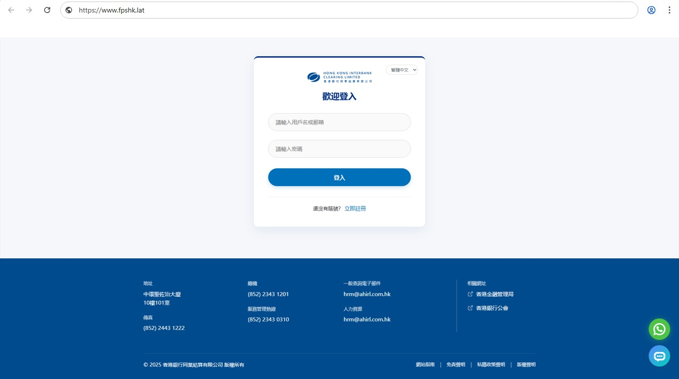 Hong Kong Interbank Clearing Limited (HKICL) would like to alert its members and the public to a fraudulent website (https://www.fpshk.lat) purported to be from HKICL. Moreover, the fraudulent website tricks user into giving away login credentials or directs user to a WhatsApp chats with the fraudster impersonating as customer service personnel.